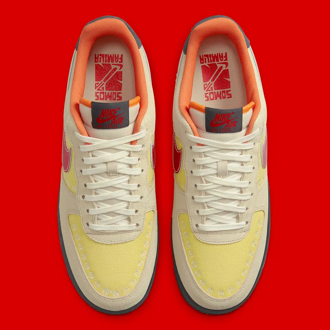 Plus besoin de présenter la Air Force 1. Ce coloris issu de la collection ‘’Somos Familia’’, en revanche, mérite qu’on lui accorde un minimum d’attention, et ce même s’il ne sortira pas officiellement en France. En attendant son arrivée sur StockX, précisons qu’il s’articule autour d’une tige complexe à base de canvas jaune pâle et de superpositions en suède dont la teinte oscille entre le beige et le gris. Un logo latéral en cuir bicolore blanc et rouge relève efficacement le design, tout comme les notes orangées appliquées sur la doublure interne et la bande verticale agrémentée de jaune vif sur le talon. Les autres éléments composant le branding se dressent quant à eux dans un rappel de rouge, sur un fond noir. Les plus attentifs auront remarqué les surpiqûres greffées au Swoosh ainsi que le logo inédit ajouté à l’arrière de chaque panneau extérieur. De même, des pictogrammes blancs ont été disposés sur le quarter panel. Une semelle noire monochrome complète le look. Avis aux amateurs, la paire devrait débarquer sur les plateformes de resell d’ici peu.