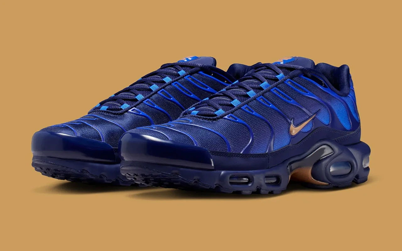 La Tn ‘’FFF’’ millésimée 2026 n’est pas simplement bleue. Elle arbore en réalité différentes nuances de bleu que les équipes créatives du Swoosh ont façonné dans un dégradé horizontal qui fait sens. L’ADN du modèle culte de 1998, signé Sean McDowell, est en effet respecté. Dans le détail, on retrouve du ‘’Game Royal’’ sur la base de la tige en mesh qui tend progressivement vers du ‘’Blackened Blue’’ sur le dessus du pied. Le bleu emblématique de l’Équipe de France évolue en outre du plus clair au plus foncé pour faire écho à la Nike Mind 001 ‘’Blackened Blue’’. Les ondulations supérieures, présentes en bonne et due forme, dévoilent quant à elles un dégradé inversé pour contraster subtilement avec la tige, tandis que des rappels de bleu foncé épousent la doublure interne, le garde-boue et la semelle intermédiaire. Bien sûr, le logo de la Fédération Française de Football, incarné par le coq, est lui aussi au rendez-vous. Sur la languette frontale, en l’occurrence, et avec un prime une finition dorée commune au Swoosh latéral, à la voûte plantaire et aux coussins d’air disposés sous le talon.